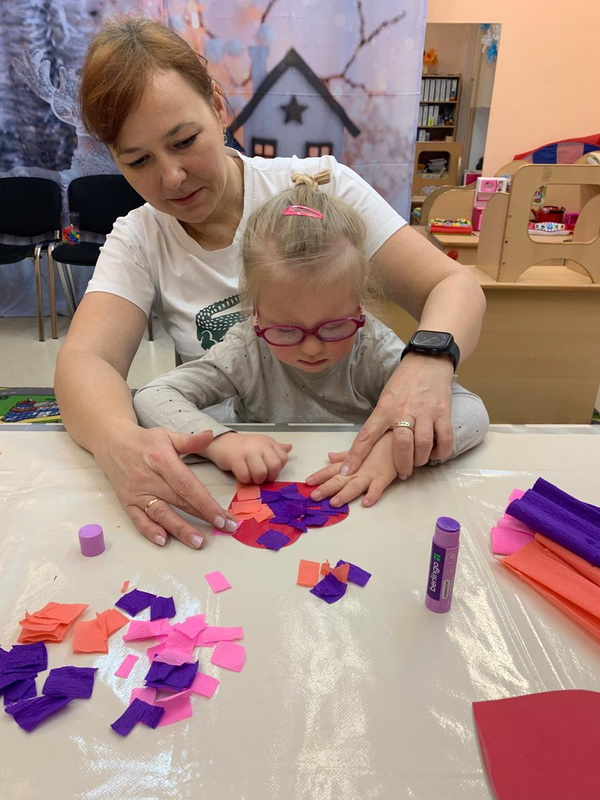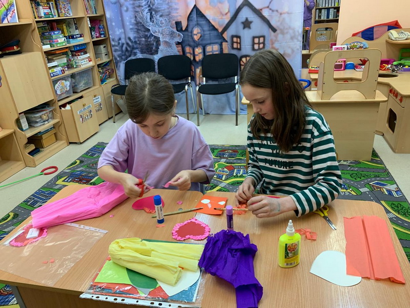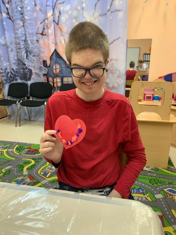 Ребята отделения социального обслуживания детей-инвалидов на занятии по аппликации сделали алое сердечко и украсили свою работу шариками из цветной гофрированной бумаги. В заключение занятия посмотрели любимый мультфильм «Осторожно, обезьянки!» про заботливую маму пятерых детей.