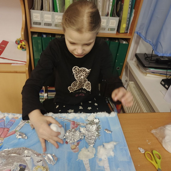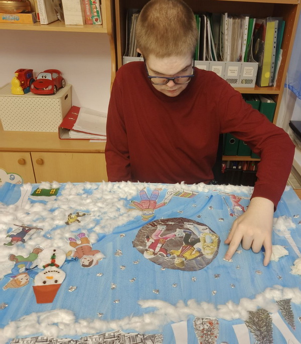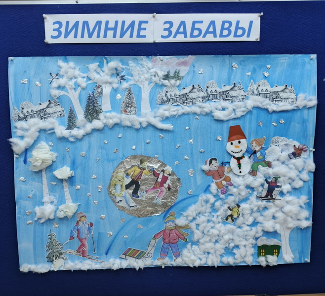 Ребята отделения социального обслуживания детей-инвалидов сделали творческую работу "Зимние забавы". Для неё понадобились лист ватмана синего цвета, клей, фольга, вата, вырезанные картинки по сюжету и, конечно же, фантазия.