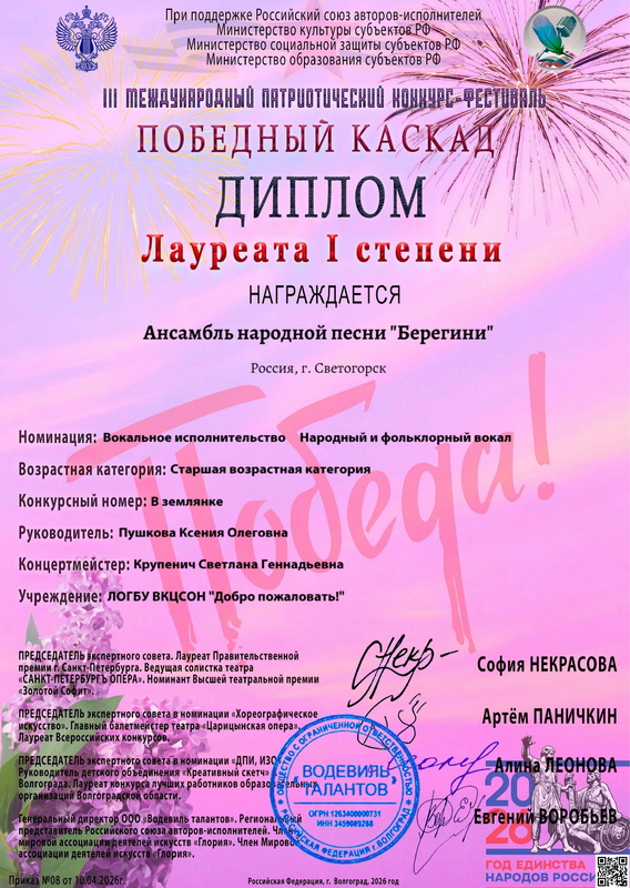 Ансамбль народной песни «Берегини» (руководитель Пушкова К.О, концертмейстер Крупенич С.Г.) и театральная студия «Стимул» (руководитель Михайлова В.В.) — Лауреаты I степени.