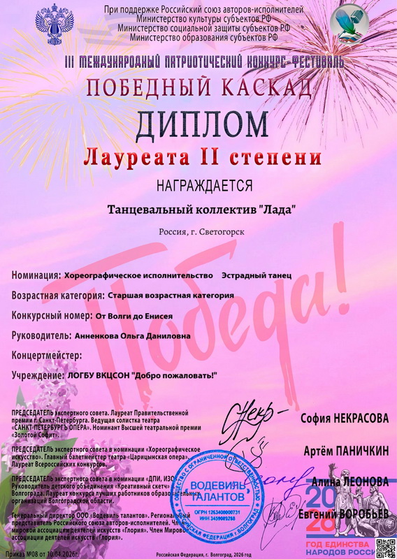 Танцевальный коллектив «Лада» (руководитель Анненкова О.Д.) и Вера Копытова — Лауреаты II степени.